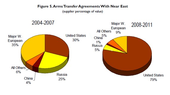 The US share of the arms trade to the Middle East has burgeoned so much in the past decade that it now dwarfs the other suppliers, as this chart [pdf] from a Congressional study makes clear.